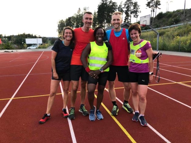Første rett var løpsintervall med 10 x 1,5 minutter med 30 sekunders pause. Dobbelt så lange drag som 45/15, men likevel en økt for fart og spenning. Det ble løpt på gress, grus, jord og tartan i og rundt friidrettsanlegget, og det ble løpt fort.
