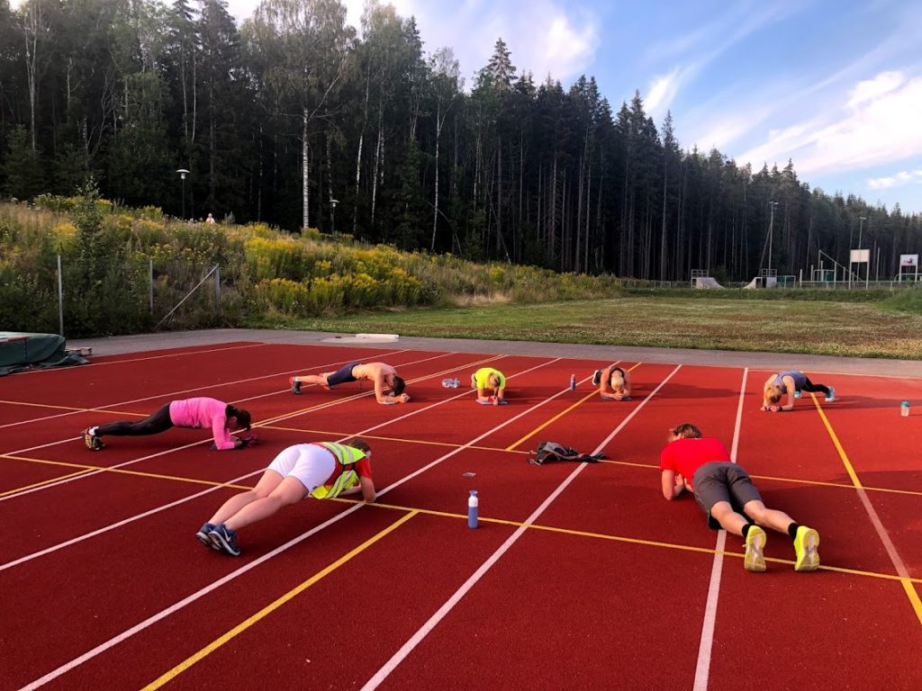 Siste rett var intervalløp med innlagt styrke. 4-3-3 minutters intervall med henholdsvis et minutt og et halvt minutts pause. Styrkeøvelsene var for beina med squats med hopp, knebøy og utfall – åtte av hver.
