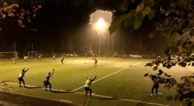 4 x 6 minutters drag inkludert 4 stasjoner,12 repetisjoner på hver øvelse: 1. dips på rekkverket, 2. gående utfall på lang strekning retning nord, 3. benopptrekk på tømmerstokken, 4. planke med tapping lang strekning bakside barnehagen. Damene transporterte seg godt gjennom løypa og jobbet hardt ved hver stasjon. På forhånd informert om at de ikke skulle ha det travelt men heller ha full fokus på 100% gjennomføring under hver styrke post.